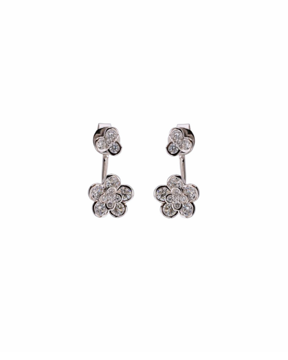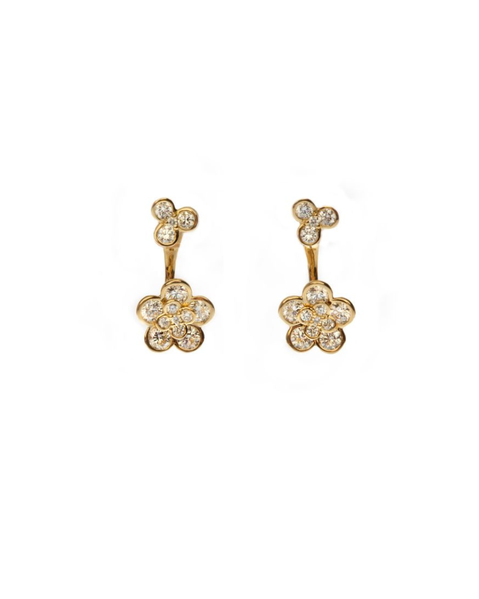 18K Gold Front and Back Flower Earrings with Diamonds. Available in both white and yellow gold.