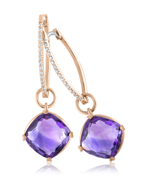 18K Rose Gold Pear Shaped Diamond Hoops with Cushion Shaped Amethyst Detachable Drops