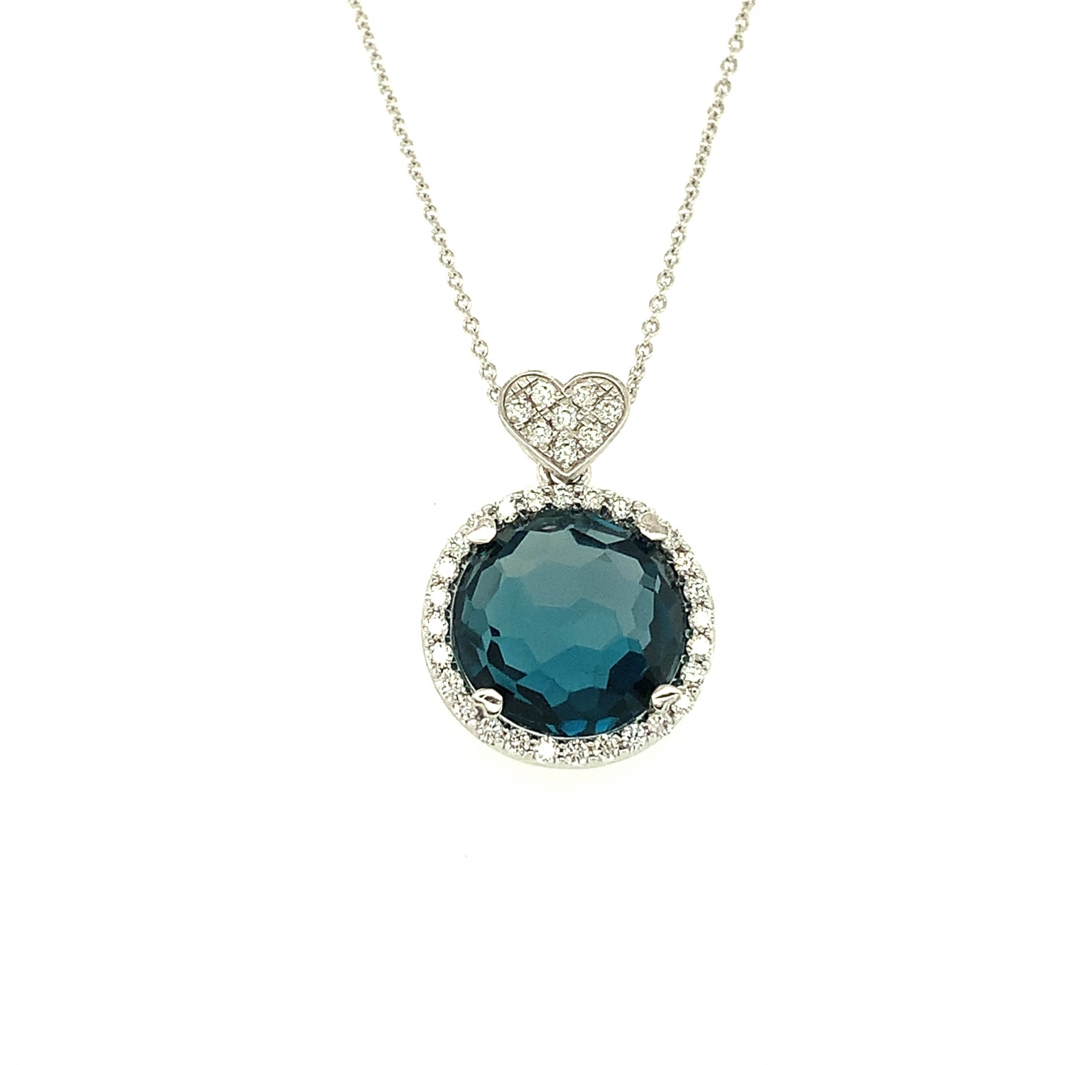 18K White Gold 11mm Round Blue Topaz Necklace with Heart Bail and Diamonds (Rhodium Plated)