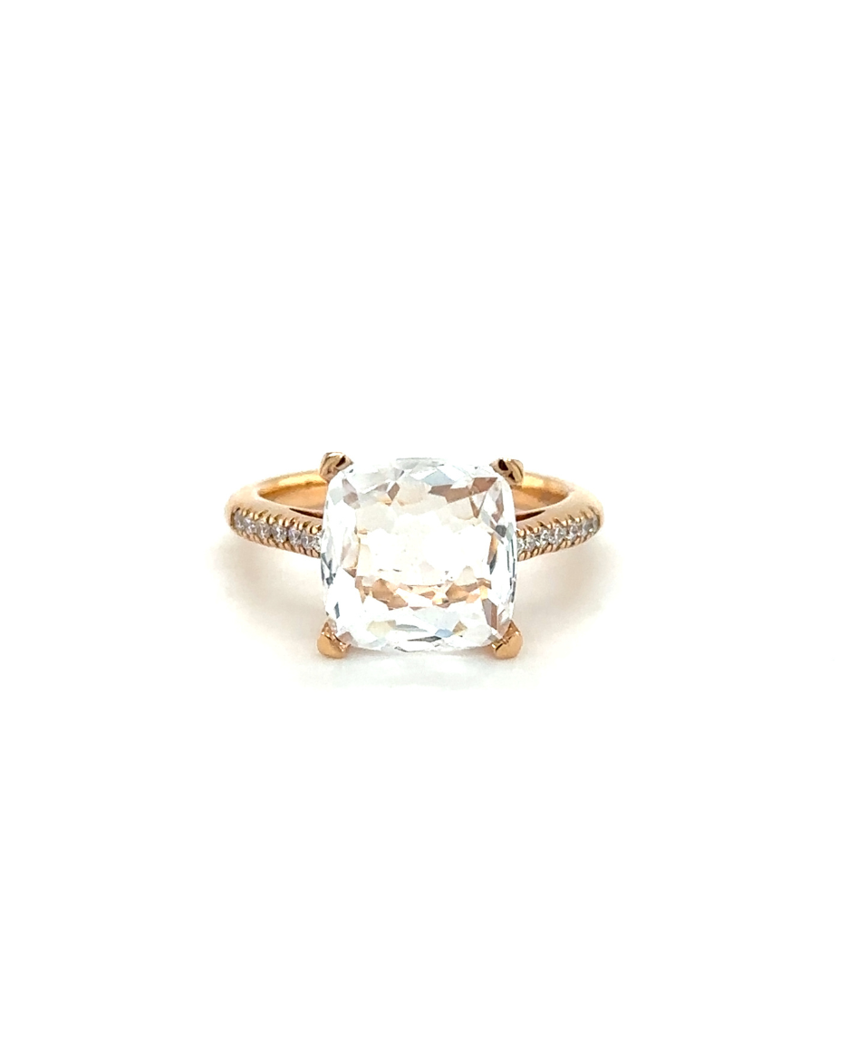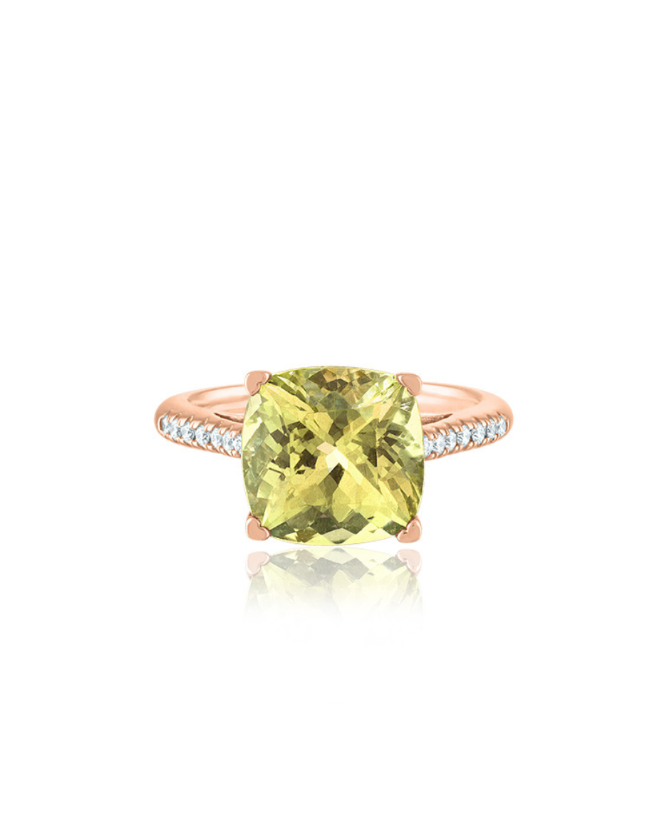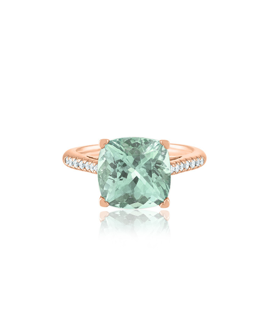 18K (Yellow, White, Rose) Gold 10mm Cushion Shaped Ring with Diamonds. Available in London Blue Topaz, Swiss Blue Topaz, Blue Topaz, Green Quartz, Aquamarine, Tanzanite, Rose de France, Amethyst, Clear Quartz, Citrine, Lemon Quartz, Indicolite.