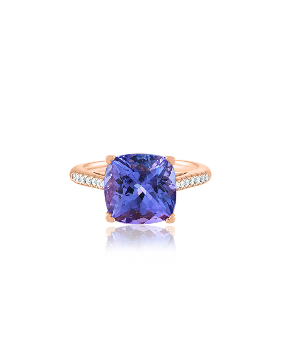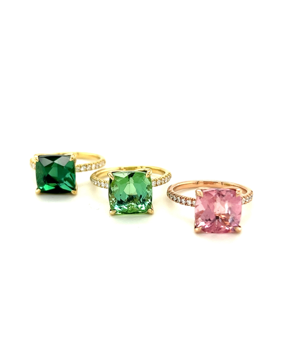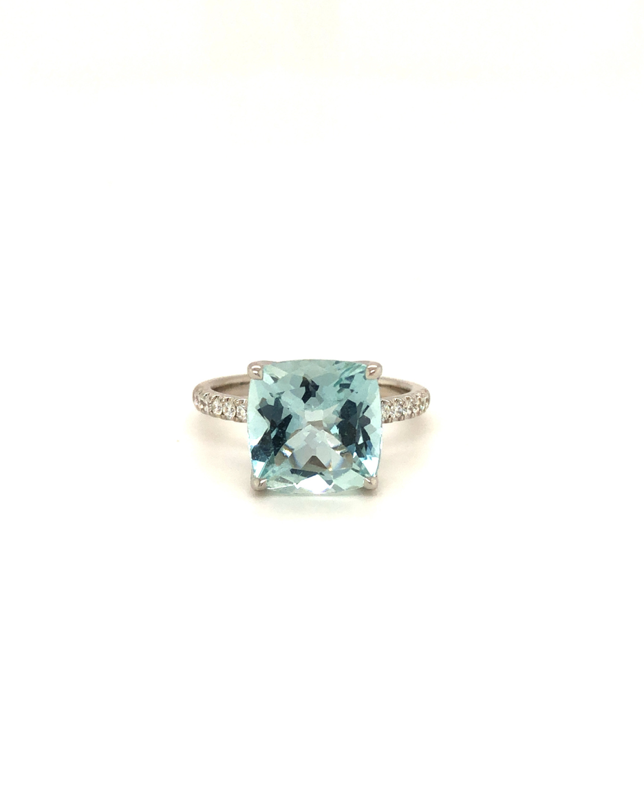 18K (Yellow, White, Rose) Gold 10mm Cushion Shaped Ring with Diamonds. Available in London Blue Topaz, Swiss Blue Topaz, Blue Topaz, Green Quartz, Aquamarine, Tanzanite, Rose de France, Amethyst, Clear Quartz, Citrine, Lemon Quartz, Indicolite.