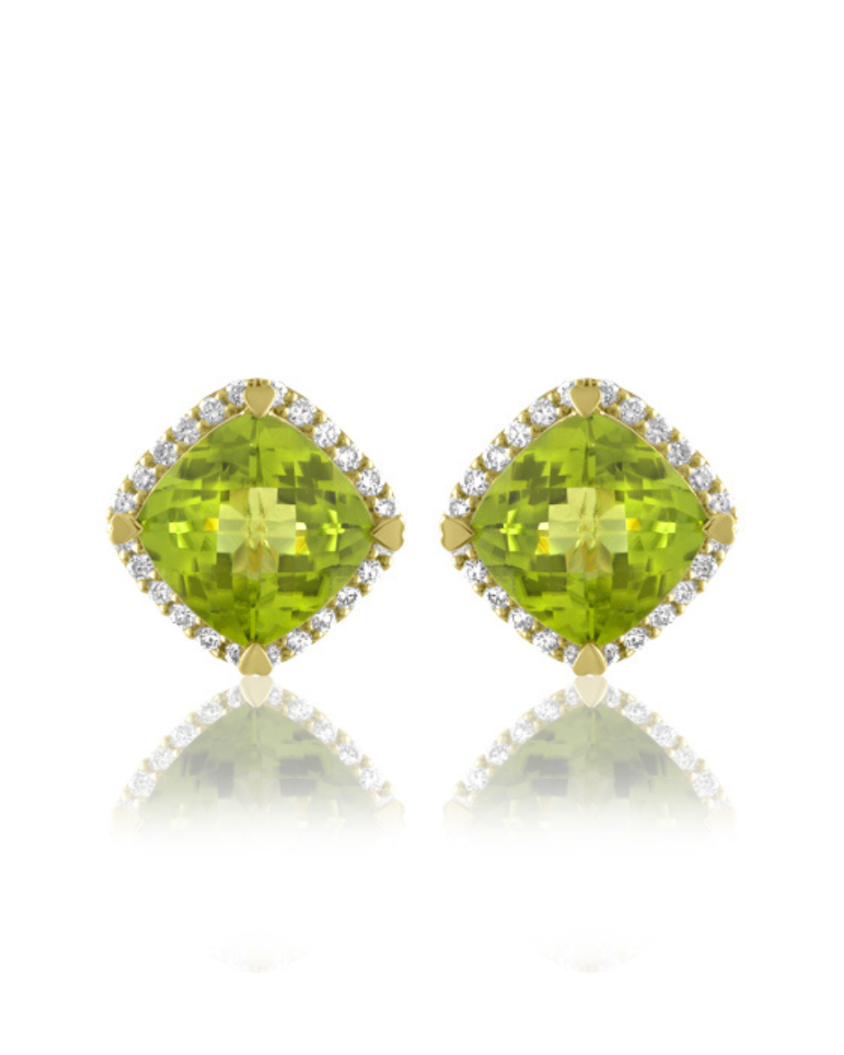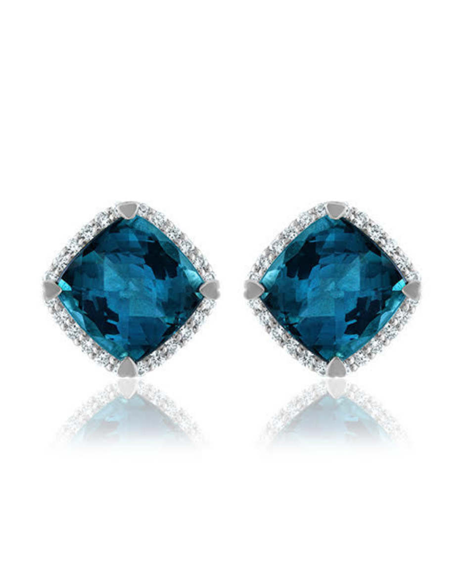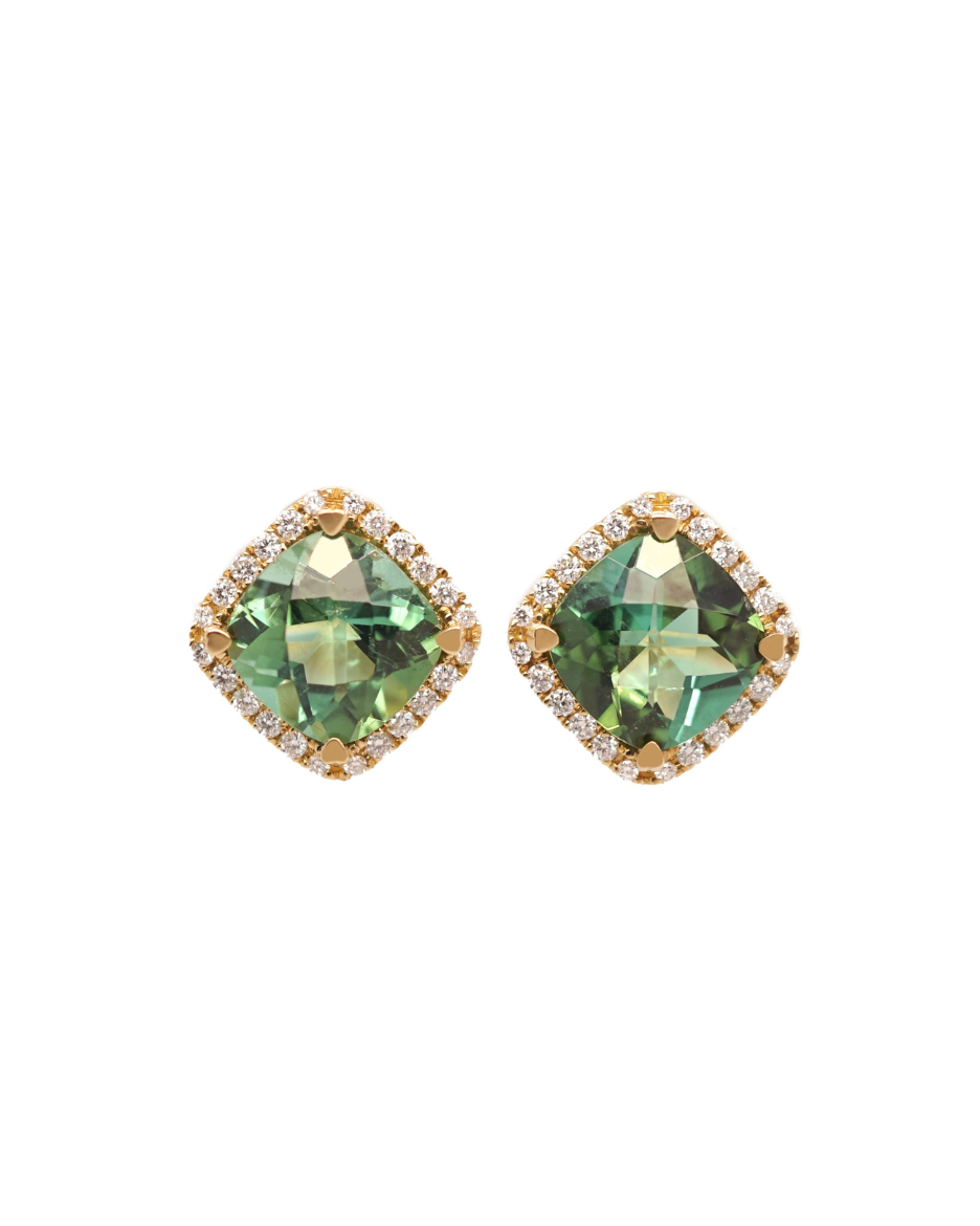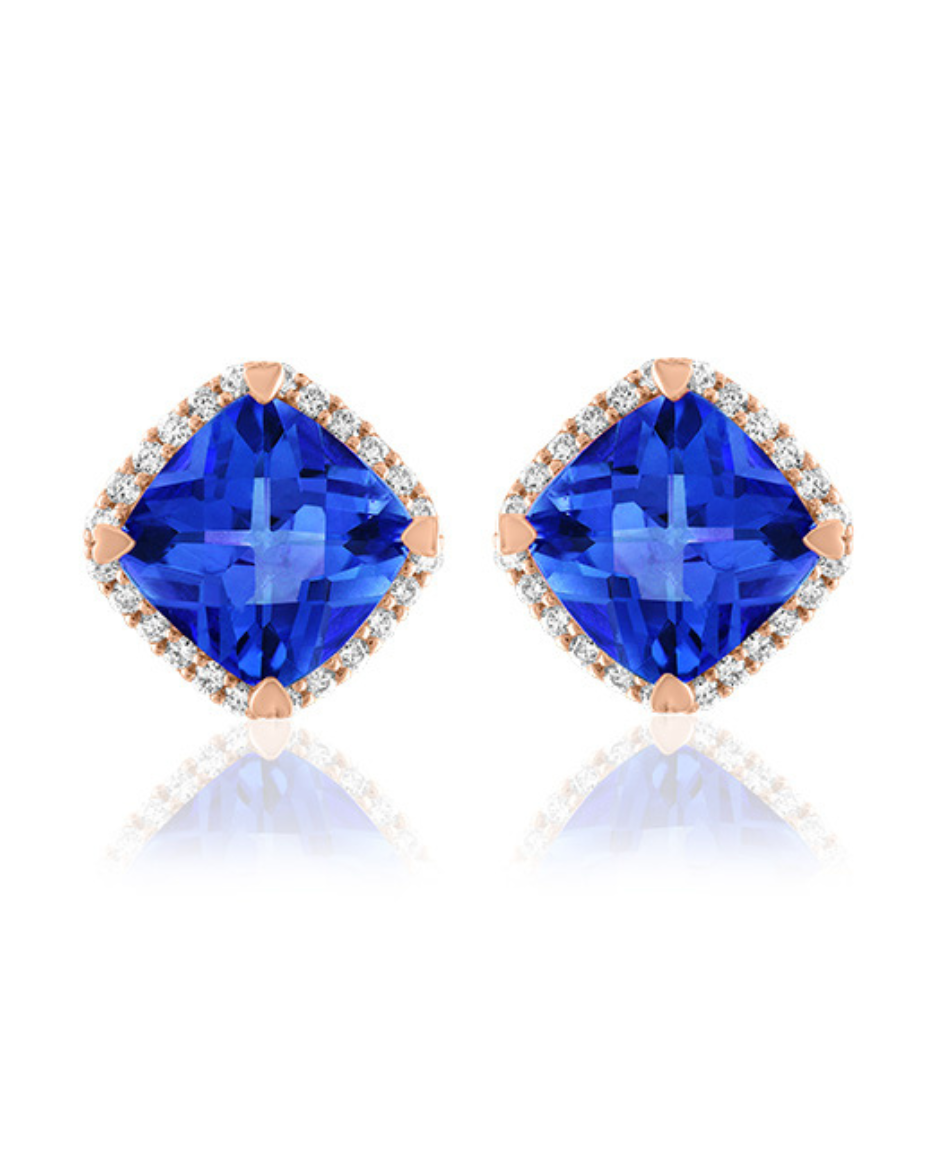 18K Gold Cushion Shaped Mini Stud Earrings with Diamonds. Available in the following stones: Tanzanite, London Blue Topaz, Blue Topaz, Indicolite, Peridot, Fire Opal, Pink Tourmaline, and Rhodolite Garnet.