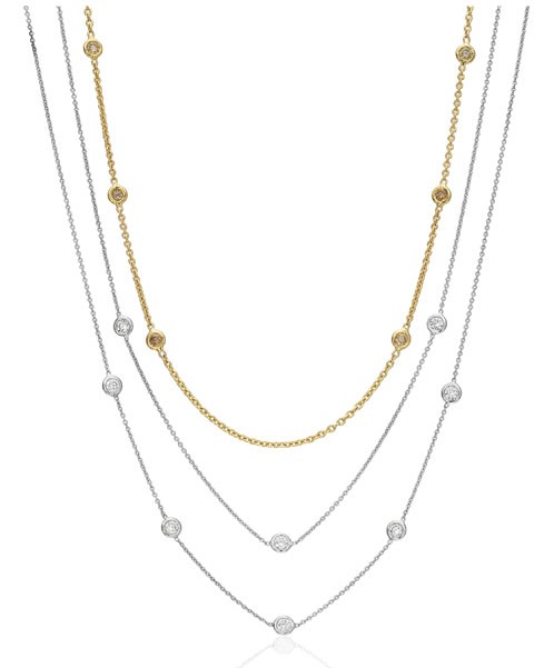 18K Gold Necklaces with diamond stations available in white, brown, black, fancy pink, or fancy yellow diamonds.