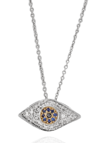 18K White Gold Evil Eye Necklace set with Diamonds and Blue Sapphires (Rhodium Plated)