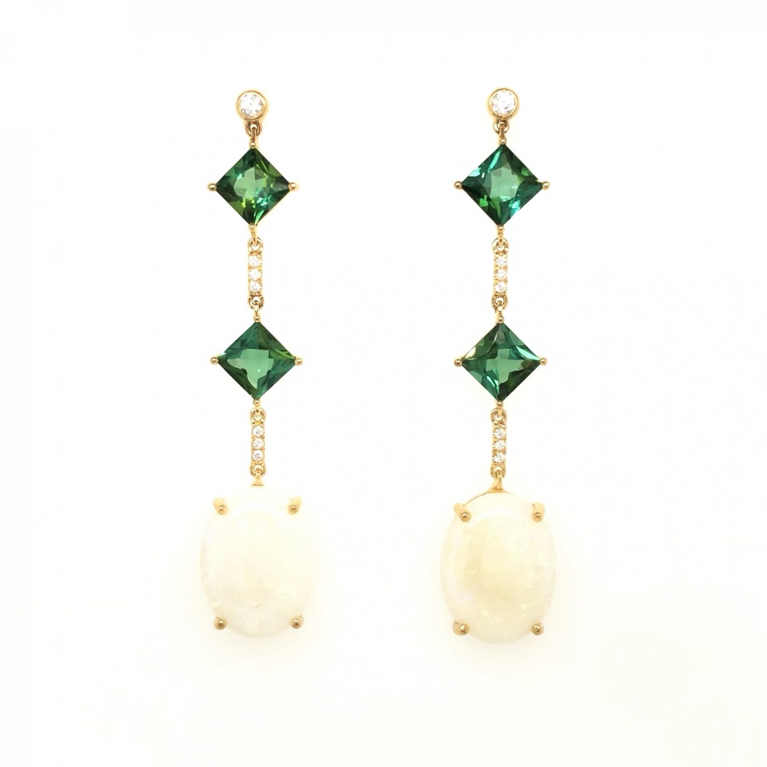 18K Yellow Gold Green Tourmaline and Australian Opal Earrings and Diamonds