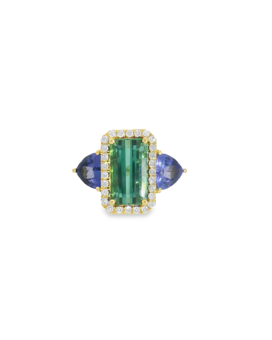 18K Yellow Gold Indicolite and Tanzanite Tri-Stone Ring with Diamonds.