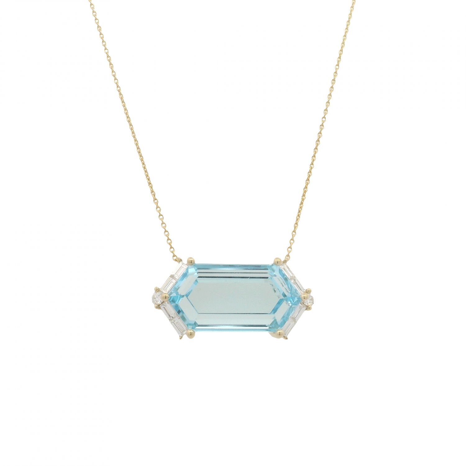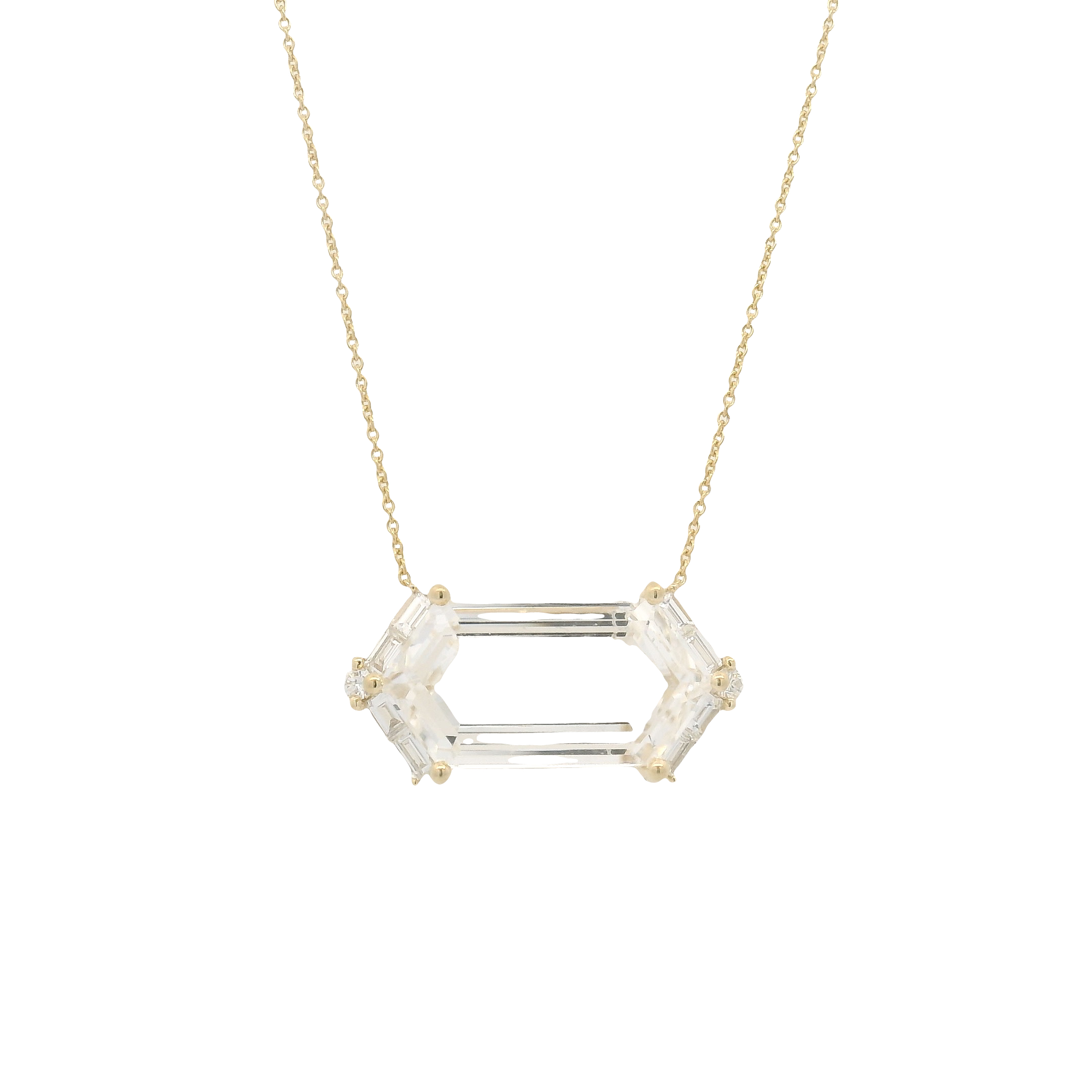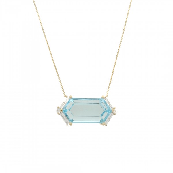 18K Yellow Gold Large Hexagon Necklaces with Diamonds. Available in Blue Topaz (13CTS), Clear Quartz (10CTS), and Rose De France (10CTS).