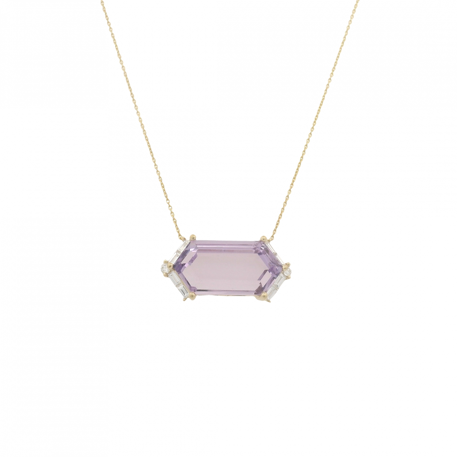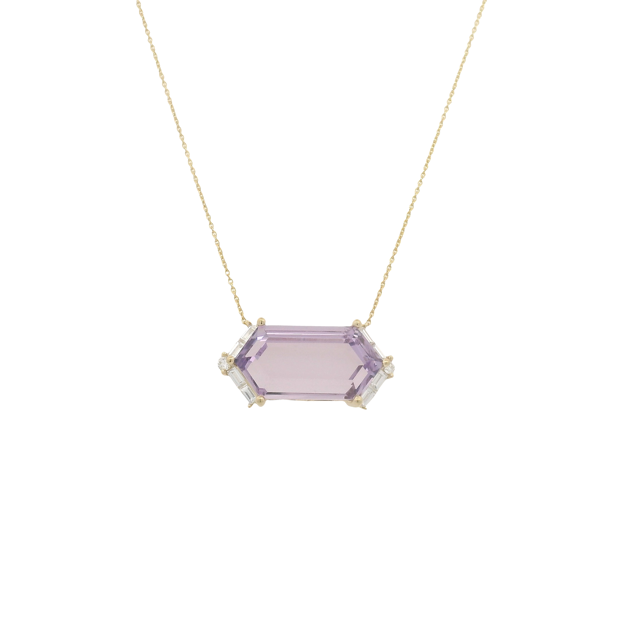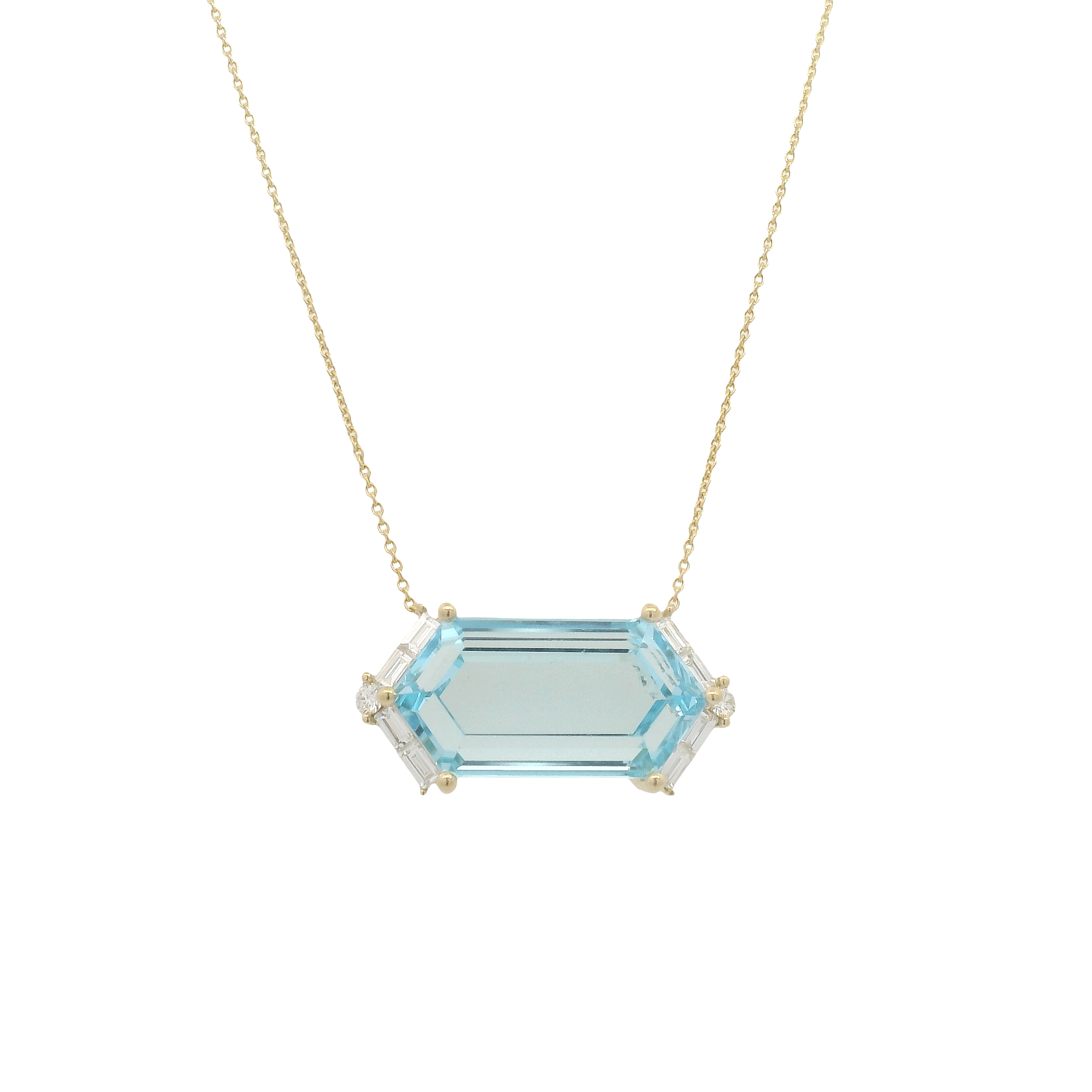 18K Yellow Gold Large Hexagon Necklaces with Diamonds. Available in Blue Topaz (13CTS), Clear Quartz (10CTS), and Rose De France (10CTS).