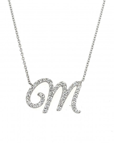18K White Gold “M” Initial Pendant with Diamonds (Rhodium Plated)