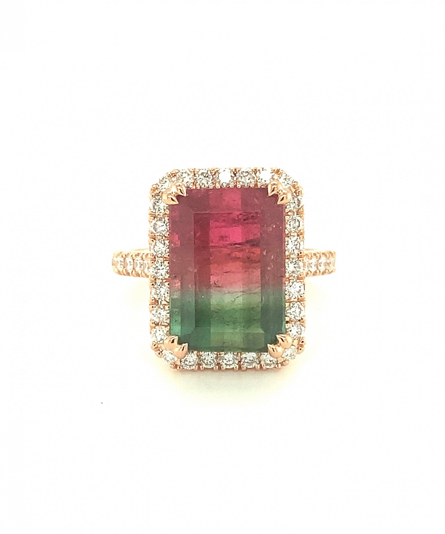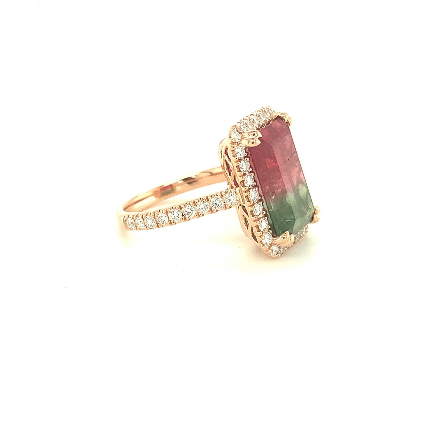 Watermelon Tourmaline Emerald Cut Ring with Diamonds