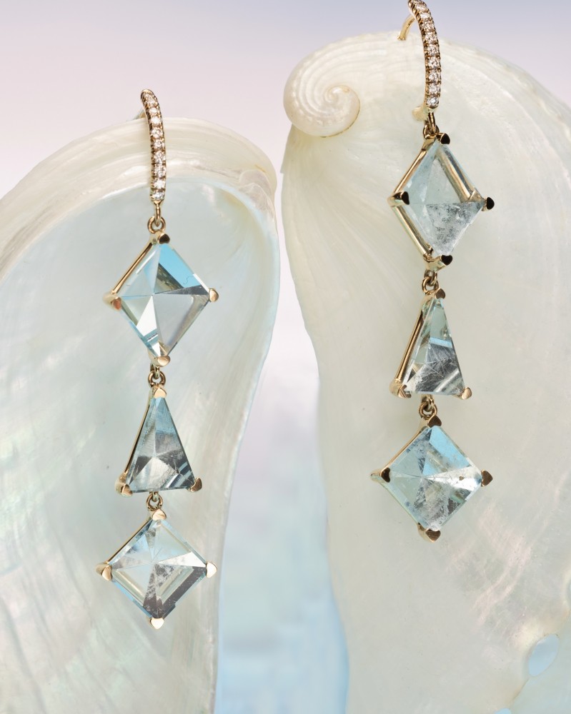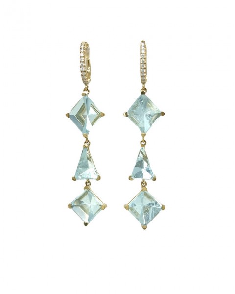 18K Yellow Gold Mirror Cut Aquamarine Earrings with Diamonds