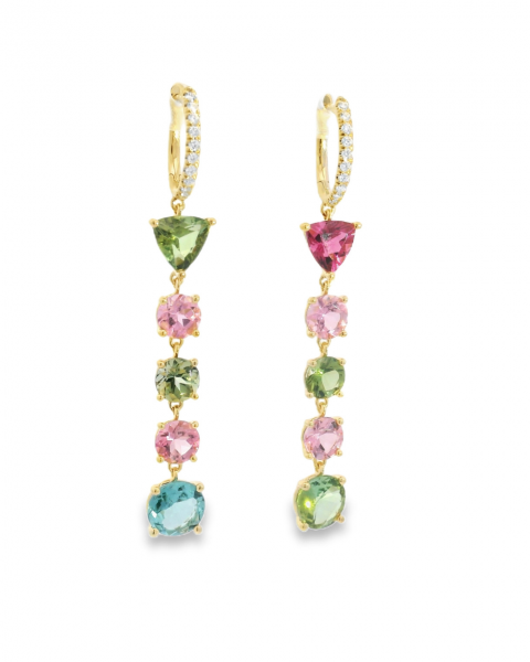 18K Yellow Gold Mix Tourmaline Asymmetric Earrings with Diamonds (5.78 CTS)