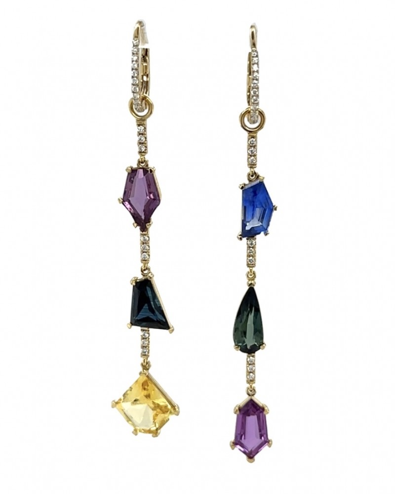 18K Yellow Gold Multi Color Mixed Sapphire Earrings with Diamonds