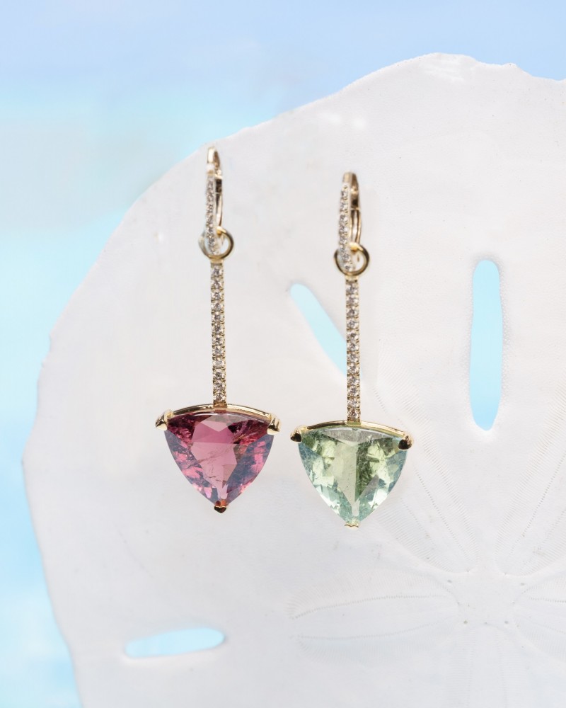 Pink & Green Tourmaline Asymmetric Earrings with Diamonds