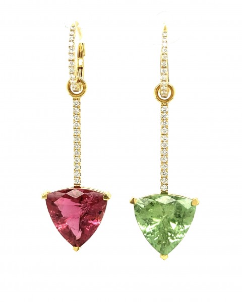 18K Yellow Gold Pink & Green Tourmaline Asymmetric Earrings with Diamonds