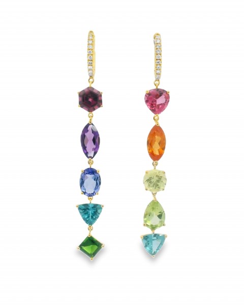 18K Yellow Gold Mix Stone Rainbow Asymmetric Earrings with Diamonds. (9.93 CTS)