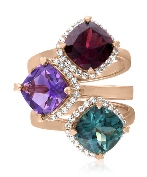 18K Rose Gold Cushion Shaped Rhodolite Garnet, Amethyst, and Indicolite Stackable Rings with Diamonds. Available in Assorted Colored Gemstones Options.