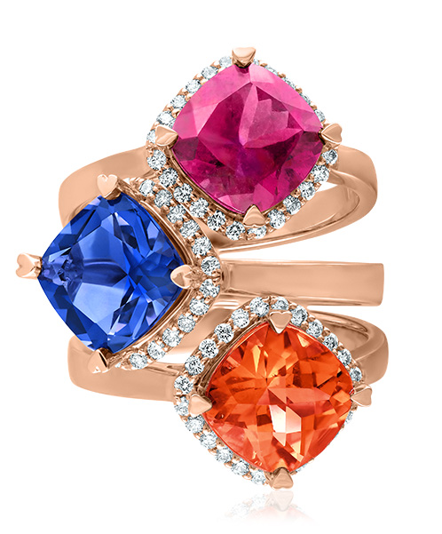 18K Rose Gold Cushion Shaped Rubellite, Tanzanite, and Mexican Fire Opal Stackable Rings with Diamonds. Available in Assorted Colored Gemstones Options.